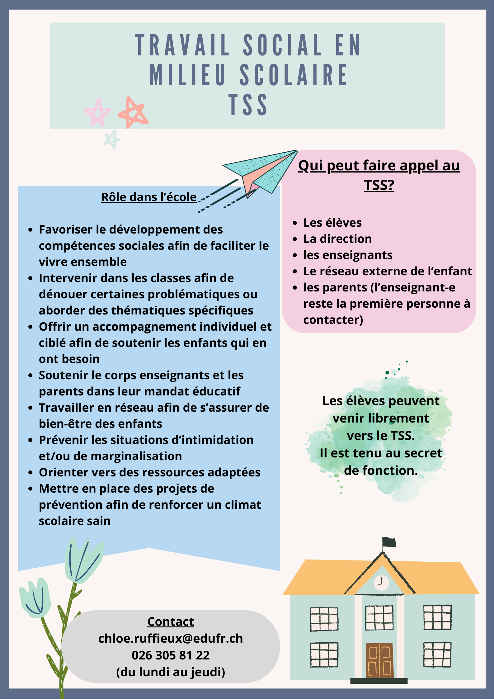 Les TSS sont soumis·e·s au devoir de discrétion.Pour le cercle scolaire de Pont-en-Ogoz, il s’agit de Mme Chloé Ruffieux.